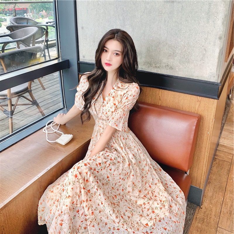 长裙泡泡袖碎花桔雪纺梗法式复古2022设计感茶歇连衣裙子轻女装奢热门设计联盟服务商